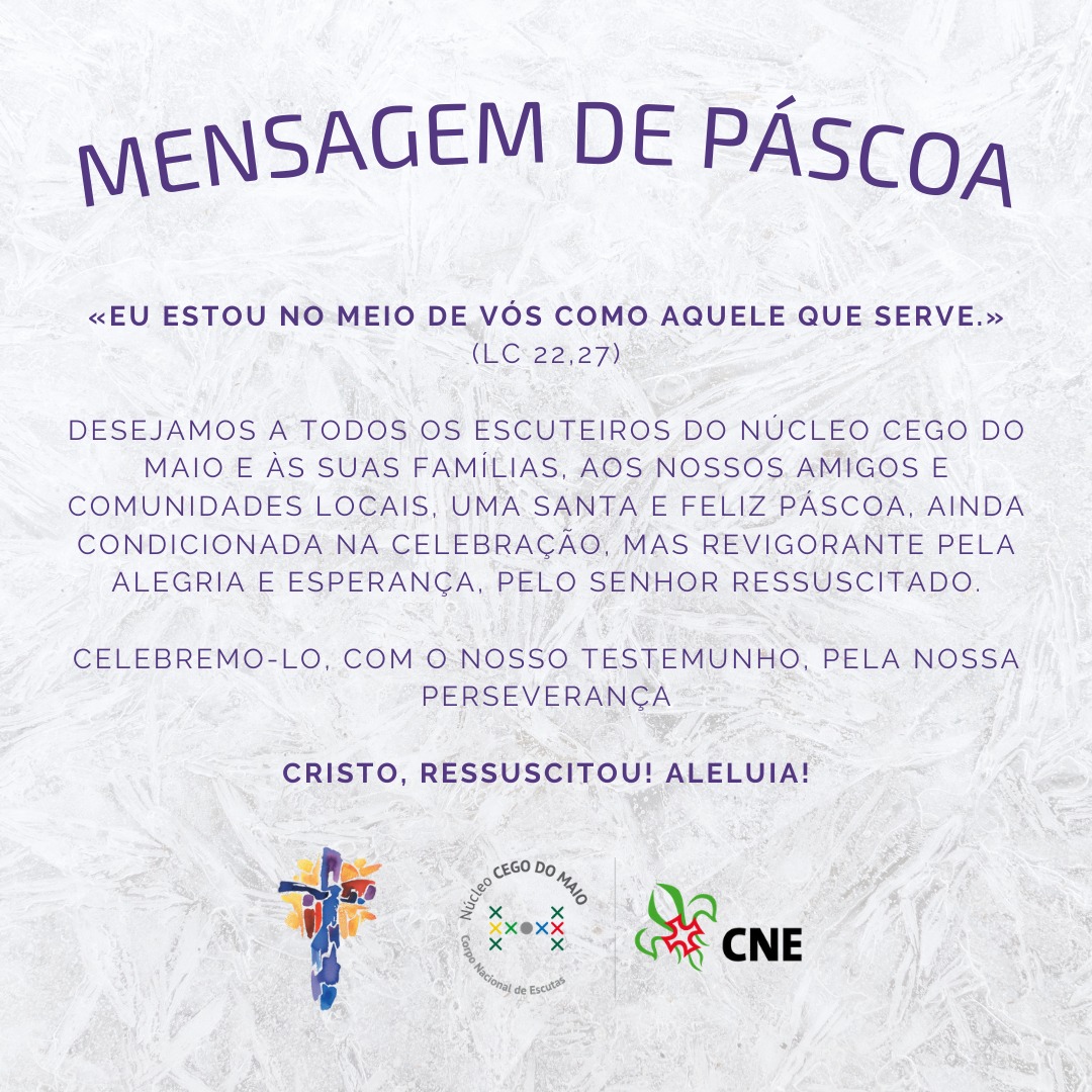 Desejamos a todos os escuteiros do Núcleo Cego do Maio e às suas famílias, aos nossos amigos e comunidades locais, uma Santa e Feliz Páscoa, ainda condicionada na celebração, mas revigorante pela alegria e esperança, pelo Senhor Ressuscitado.